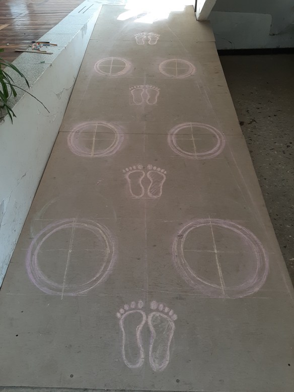.Ընդհանուր հարթակը ներկել մոխրագույն, ոտնահետքերը դեղին, շրջանները մանուշակագույն։